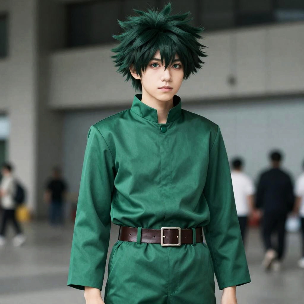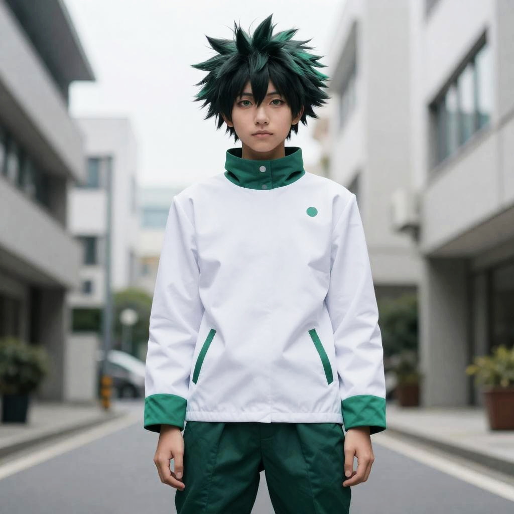 Hero Academia Izuku Cosplay, anime character in green and white outfit standing on street with buildings in background