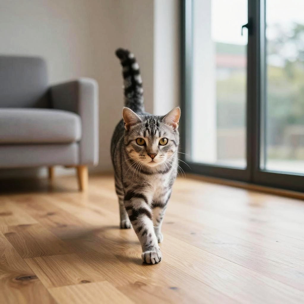 Striped silver American shorthair cat with golden eyes confidently walking toward the viewer across modern minimalist lounge with light wood flooring and clean lines, lit by natural soft daylight coming from large glass windows. Natural textures of fur, fabric, and wood emphasized; inviting and homey atmosphere; shallow depth of field; crisp whiskers; soft vignetting; balanced composition; subtle film grain; realistic color rendering; gentle contrast; fine detail throughout.