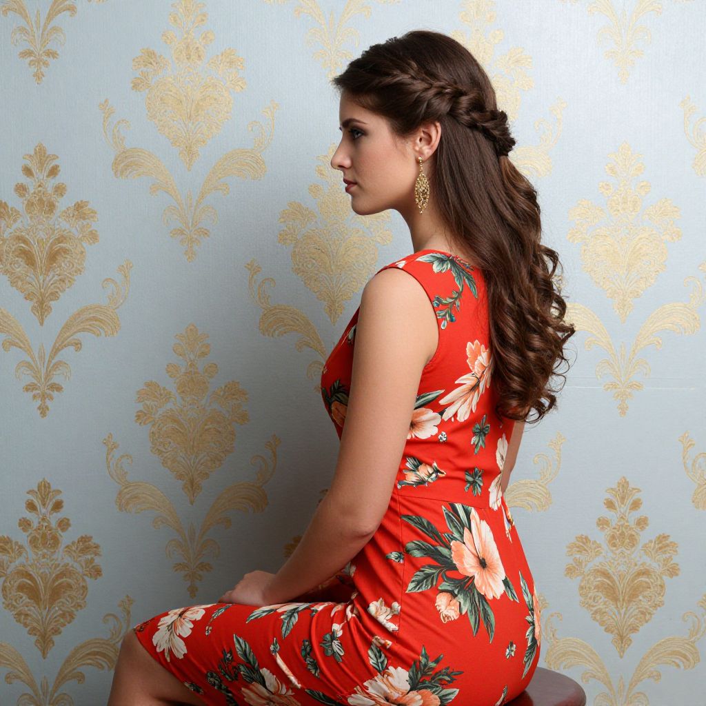 Woman seated in profile, wearing a vibrant red floral dress, her back turned to the viewer, with cascading brown hair styled in an elegant braid, adorned with dangling gold earrings, against a light blue wallpaper featuring golden floral patterns.
