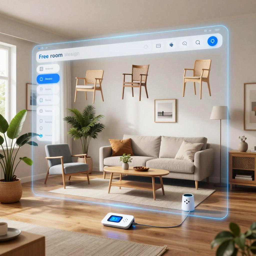 Free room design AI interface visualized as holographic display projecting furniture arrangements, cozy living room setting with plants, wooden floors, Scandinavian style décor, smart home devices integrated, creative and modern interior design process captured in digital art