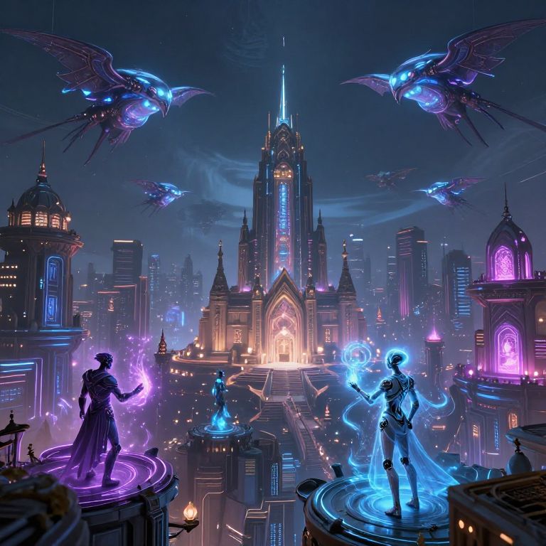 Ai.fantasy concept art depicting a sprawling city where magic and artificial intelligence coexist, with floating drones shaped like mythical creatures, neon-lit temples, and humanoid AI sorcerers performing spells in a cyber enchanted urban environment.