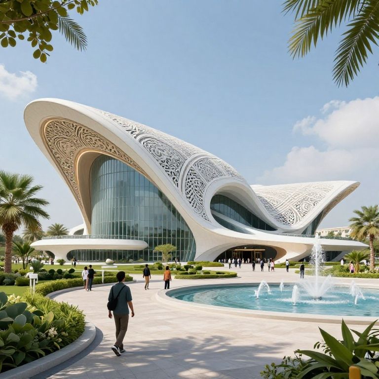 Photograph of an ornately patterned, futuristic white building with curved, flowing architecture, surrounded by palm trees, a blue sky, and a circular