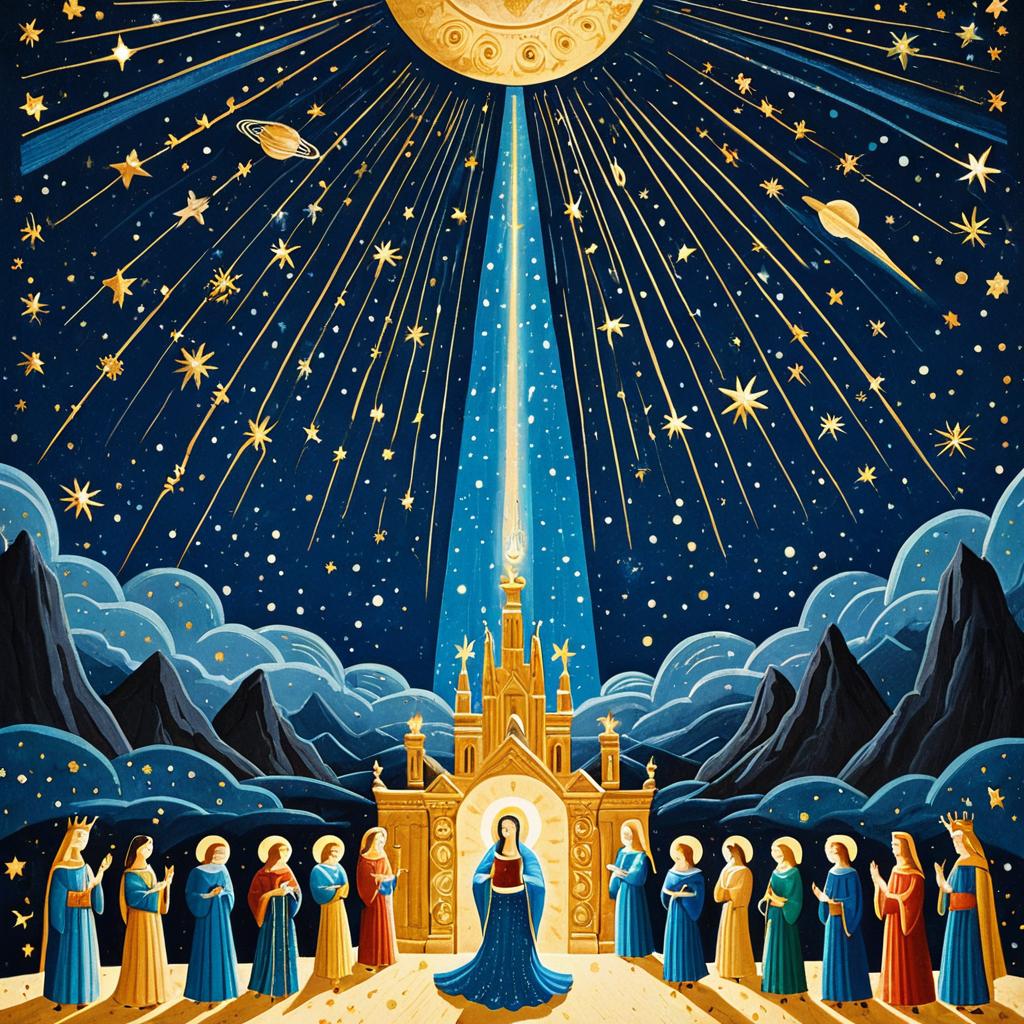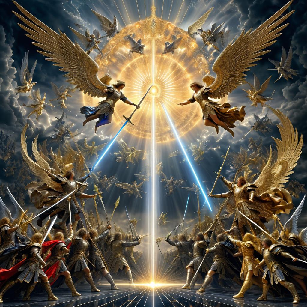 In the style of Gustave Doré, depicting a celestial mythical battle, featuring angelic warriors, swirling galaxies, radiant swords. Super detailed, blue, gold, stars, gold leaf, celestial themes.