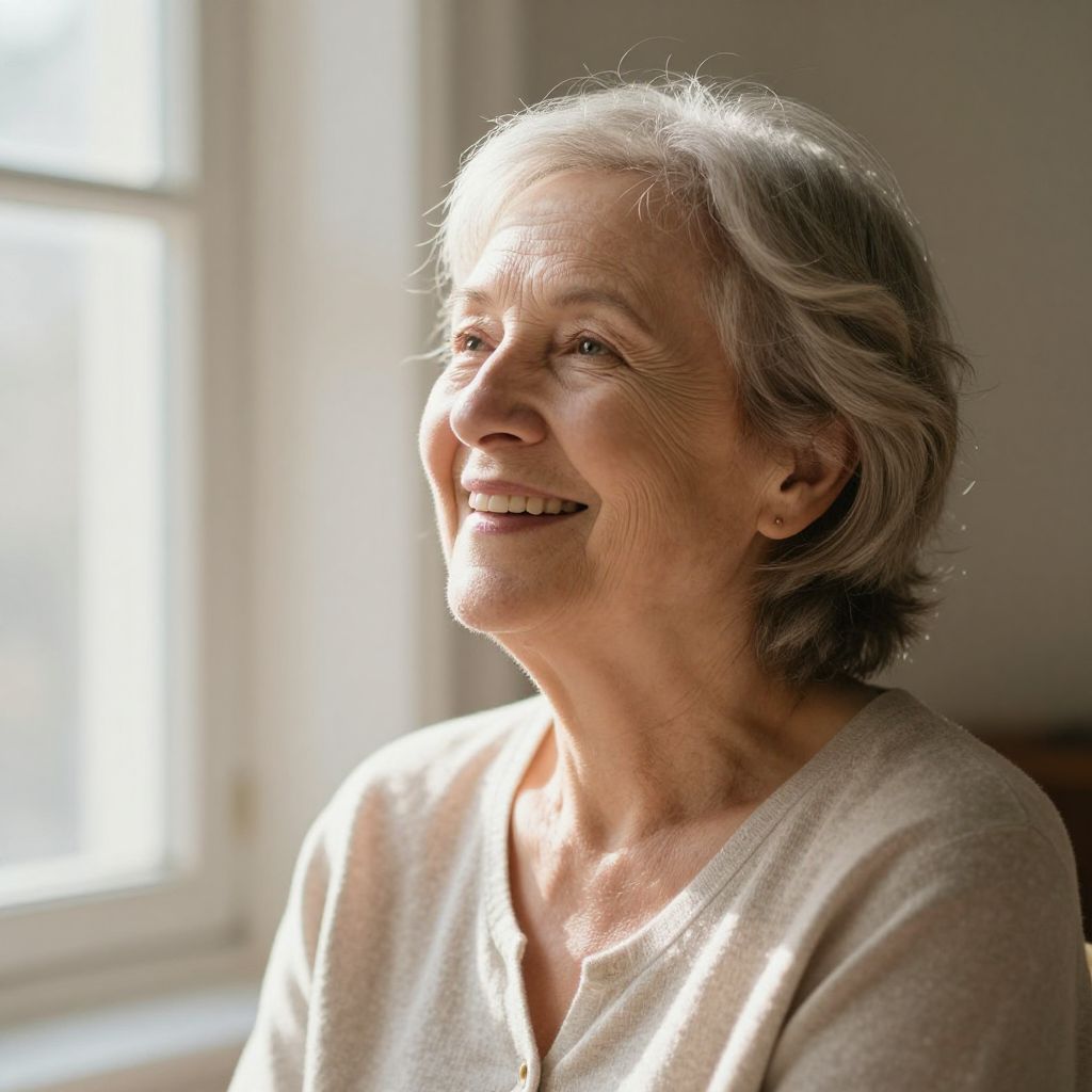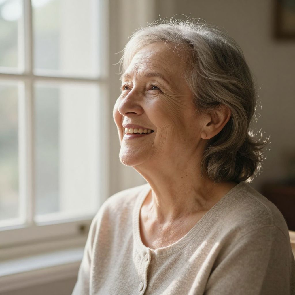 Radiant serenity and enduring hope shine through the gentle smile of a senior woman, her laughter echoing warmth and resilience, as soft sunlight filters through the window, casting a quiet embrace of renewal.