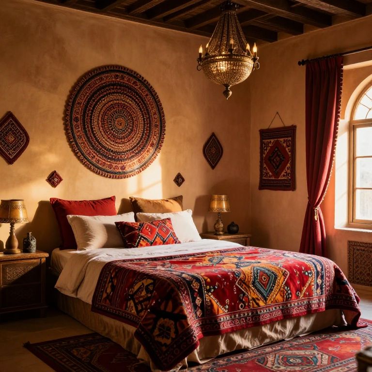 Photograph of a warmly lit, rustic bedroom with earthy, beige walls. A large, intricately patterned, circular tapestry hangs above a bed adorned with a vibrant, multicolored, patterned bedspread and red, white, and brown pillows. Two ornate, patterned diamond wall hangings flank the tapestry. Dark wooden ceiling beams support a hanging, brass chandelier. A window with dark red curtains on the right allows sunlight to stream in. Nightstands with brass lamps and decorative items flank the bed. The floor has a patterned rug, enhancing the room's rich, traditional aesthetic.