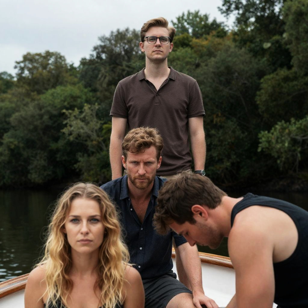 Photograph of three people wading through a river, pulling a rope. The left person is bald, shirtless, and wearing brown pants. The middle person has curly hair, wears a blue coat, and beige dress. The right person has short brown hair, wears a green jacket, and holds a red can. Dense green foliage in the background, with rocks on the riverbank. Reflections in the water. All three people are focused and have determined expressions.