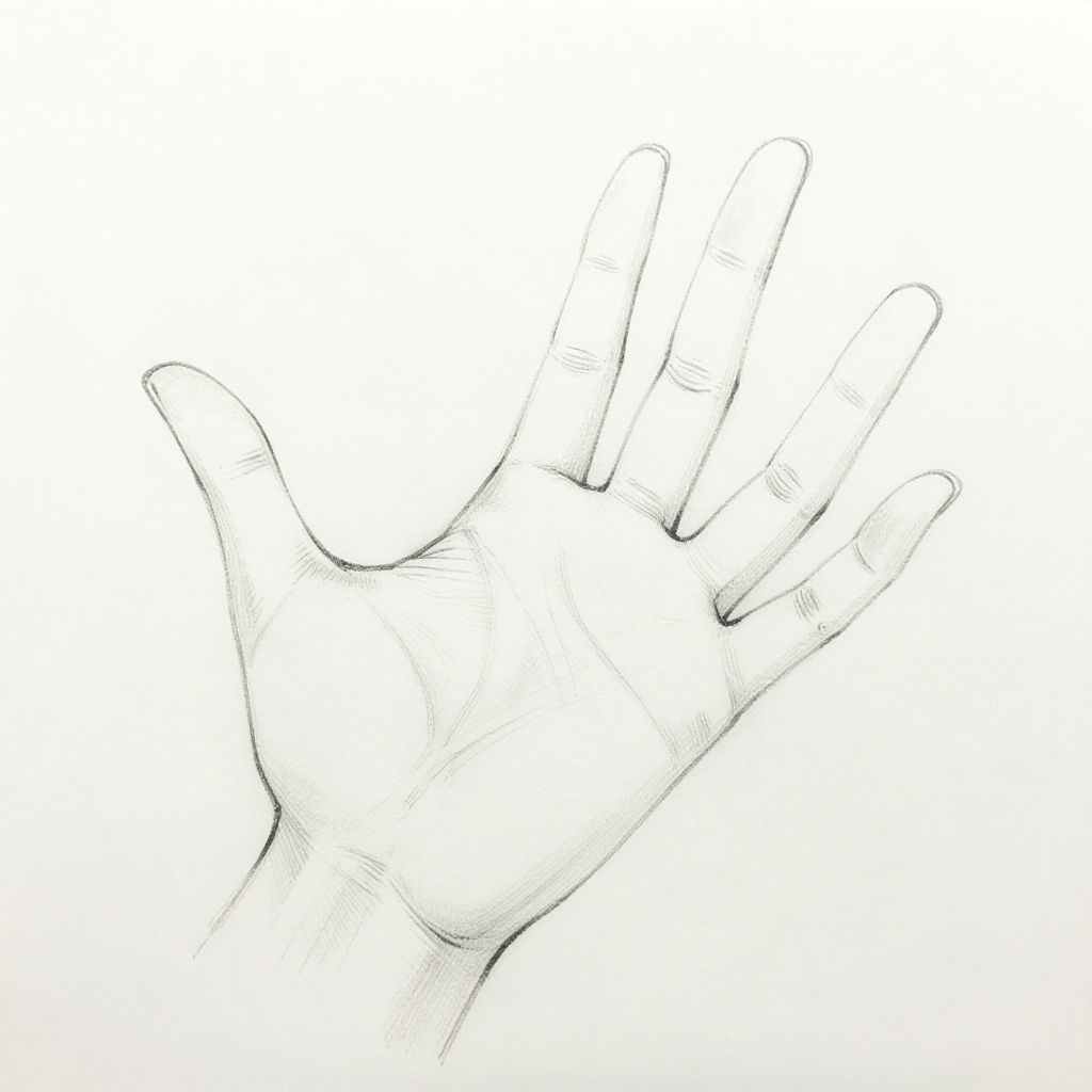 Anime hand sketch displaying an open palm with slender fingers extended upward, fluid, elegant line work and fine cross-hatching for shading, rendered in monochrome tones, emphasizing the grace and movement typical in anime drawing tutorials.