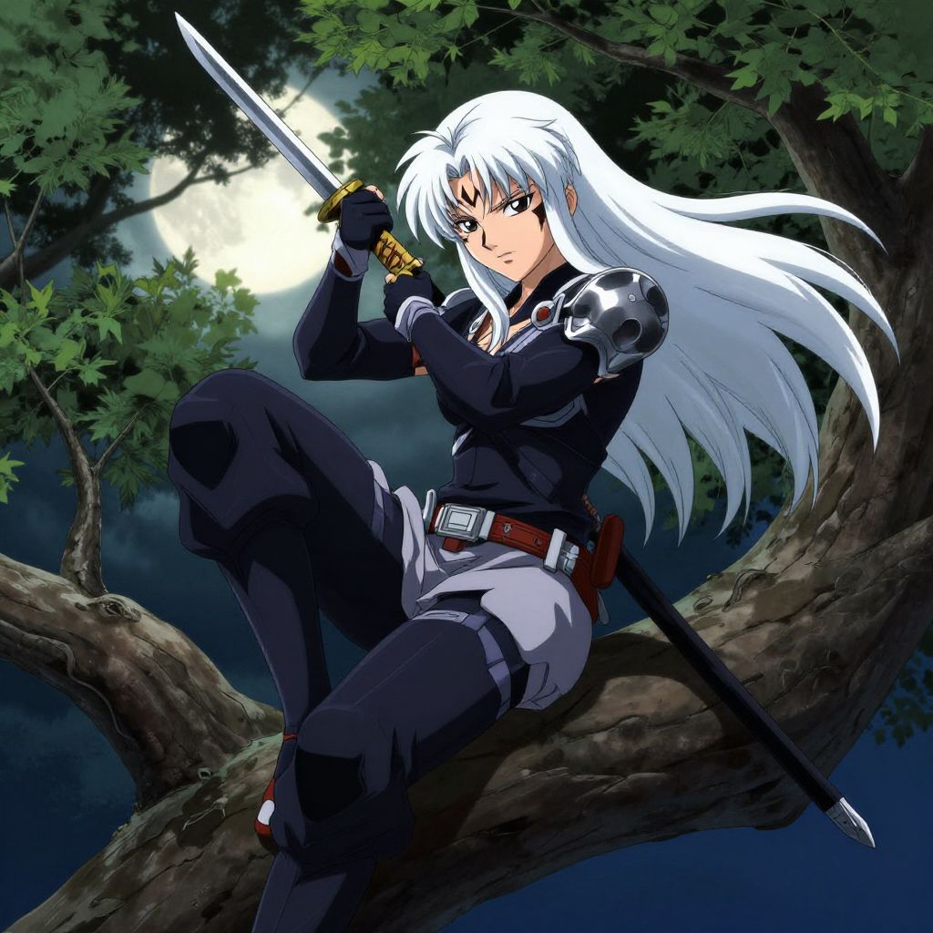 White hair ninja anime heroine perched silently on a tree branch, moonlight filtering through leaves, elegant and lethal pose with dual daggers, detailed facial markings and armor, serene yet tense mood with dynamic shadows, vibrant anime art style with a hint of fantasy.