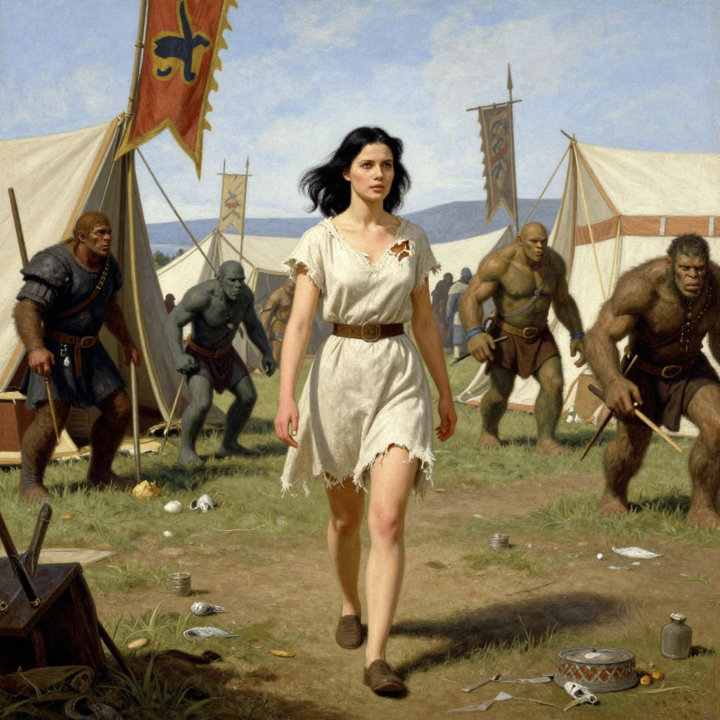 Digital painting of a brave woman in a white dress walking through a camp with muscular, angry, armed orcs in the background.