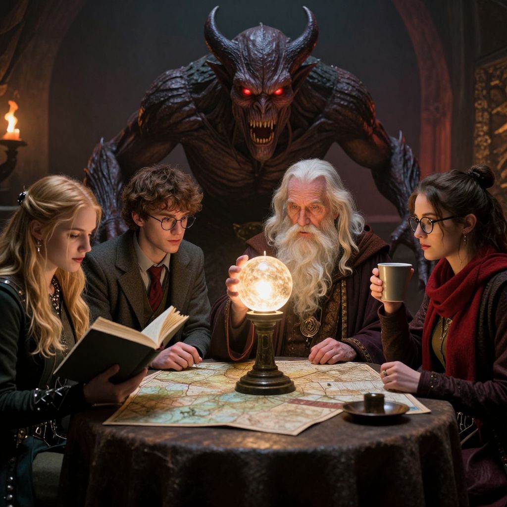 In this Dungeons & Dragons-style scene, a group of adventurers and a monstrous creature gather around a table, engrossed in their preparations for an upcoming quest. The central figure, an elderly wizard with a long white beard, holds a glowing orb, casting a warm light that illuminates the group. To his left, a young woman with long blonde hair reads a book, her expression focused. Beside her, a young man with glasses and a red tie studies a map, his attention intent. On the right, another young woman, wearing glasses and a red scarf, holds a cup, seemingly ready for a warm beverage. In the background, a menacing demon-like creature looms, its fiery eyes glowing red, adding an element of danger to the scene. The overall composition is dynamic, with each character and creature positioned in a way that creates a sense of anticipation and readiness for their adventure.