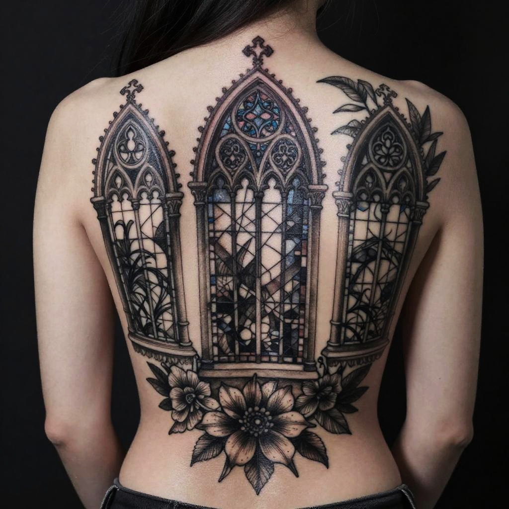 Gothic tattoos for females, dark and delicate motifs including elaborate crosses, bats, ravens, and intricate filigree with a vintage gothic vibe, sharp linework and subtle shading, showcasing a blend of beauty and darkness on the upper arm