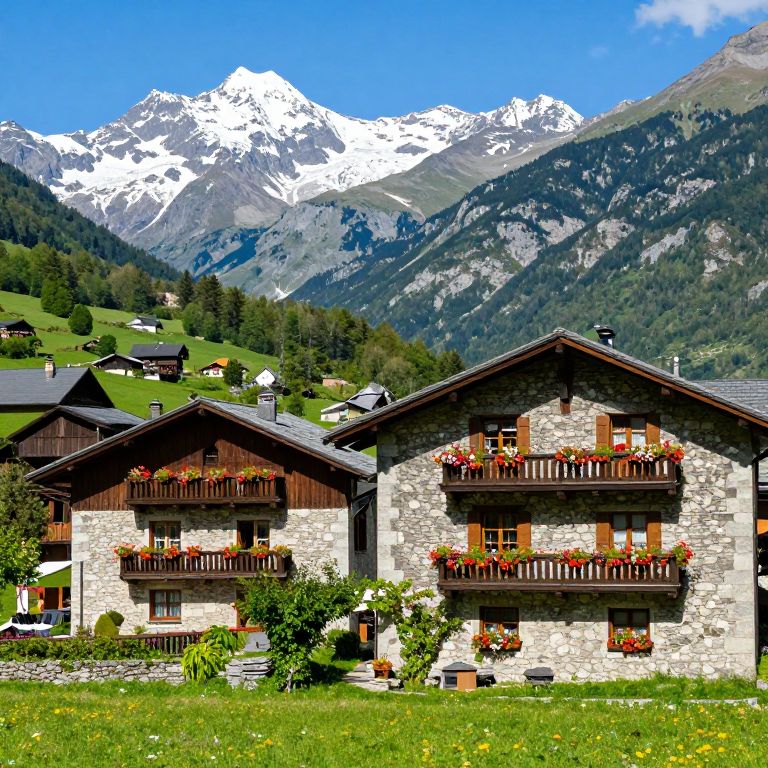 Photograph of two traditional Alpine chalets with stone and wooden facades, set against a backdrop of towering snow-capped mountains under a clear blue sky. The chalets have dark wooden balconies adorned with vibrant red and yellow flowers. The foreground features a lush green meadow with scattered yellow wildflowers. Other similar chalets are visible in the mid-ground, nestled among green hills. The chalets' windows and doors are wooden, and the roofs are dark grey. The overall scene exudes a serene, picturesque mountain village atmosphere.