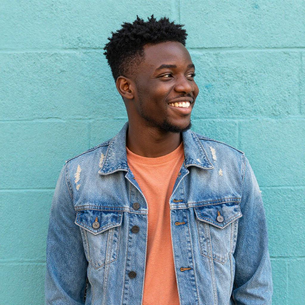 Photograph of a smiling, young Black man with short, curly hair, standing against a bright turquoise brick wall. He's wearing a light blue denim jacket over an orange t-shirt. His head is tilted slightly to the right, and he's looking off into the distance with a cheerful expression. The jacket has worn-in details, and the wall has a slightly rough texture. The overall vibe is casual and relaxed.