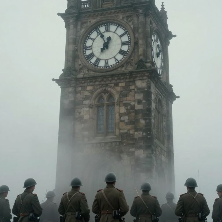 Mist-shrouded soldiers gather below a towering stone clocktower, its massive faces bearing stark black numerals and hands, as the ethereal fog swirls around the base, evoking a haunting tableau of history and remembrance.