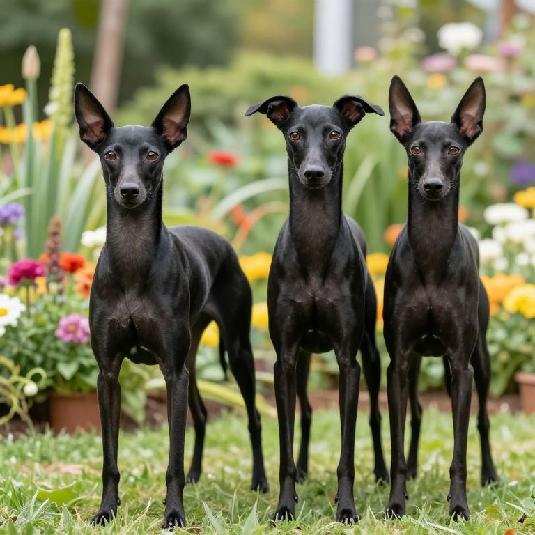 Skinny black dog breeds posing together in a bright botanical garden, surrounded by colorful flowers and greenery, highlighting their lean physiques and shiny black coats with soft lighting