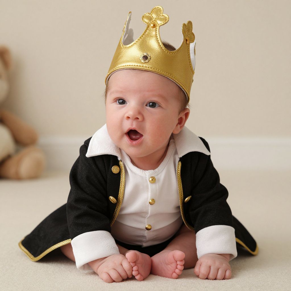 Newborn Prince Charming Costume, a close up of a baby wearing a crown sitting on the floor