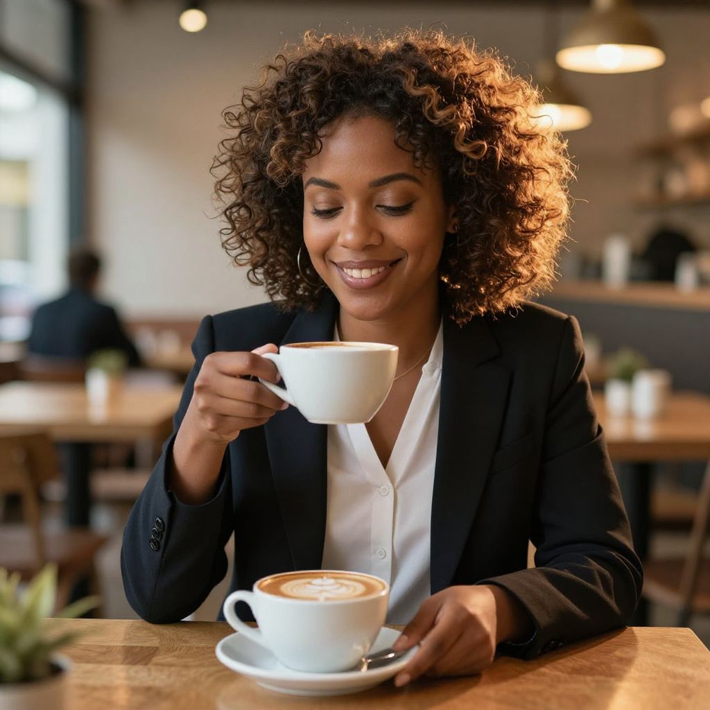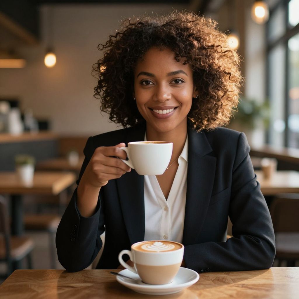 Photograph of a smiling Black woman with medium-brown skin and curly, voluminous hair, wearing a black blazer over a white blouse. She holds a white coffee cup in her right hand, raised to her lips, while a matching cup on a saucer sits on the wooden table in front of her. The background is a warmly lit, cozy café with wooden tables, chairs, and blurred hanging lights. Sunlight streams through large windows on the right, adding a soft glow to her hair and the café's interior. The overall atmosphere is inviting and relaxed.