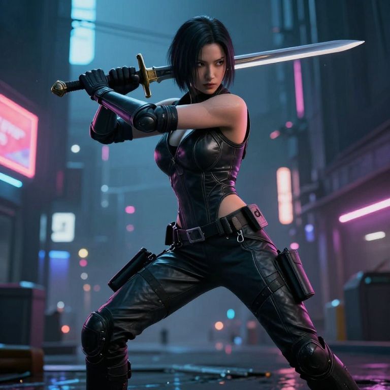 Digital artwork of a fierce, black-haired woman in black leather outfit, wielding a glowing sword in a neon-lit cyberpunk city street.