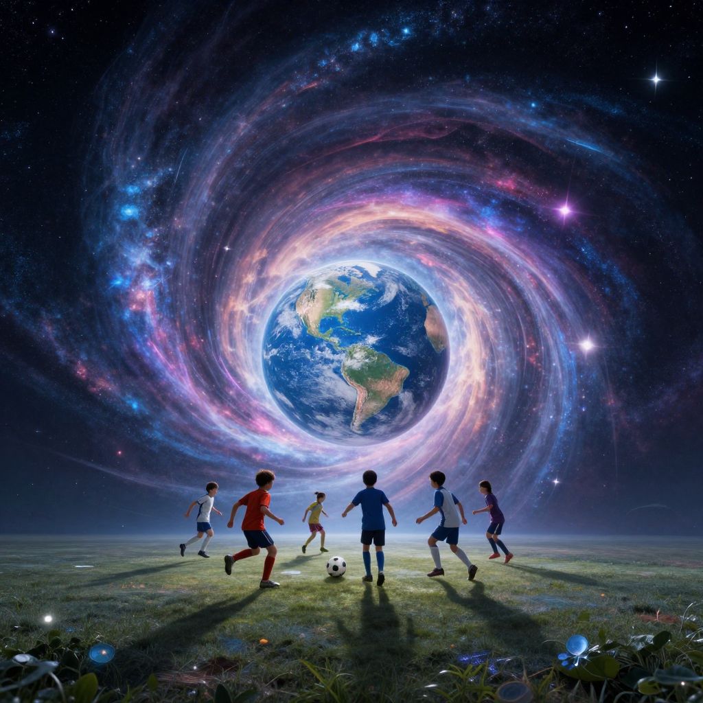 Children play soccer beneath a swirling cosmic vortex, where the boundary between Earth and the universe dissolves into a mesmerizing blend of light, stars, and infinite possibility.