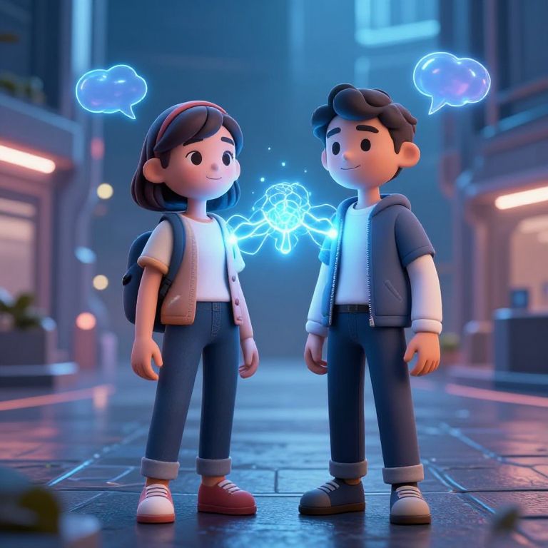 CGI cartoon image of a boy and girl standing on a neon-lit street, both with glowing blue thought bubbles, wearing casual clothes, backpack,