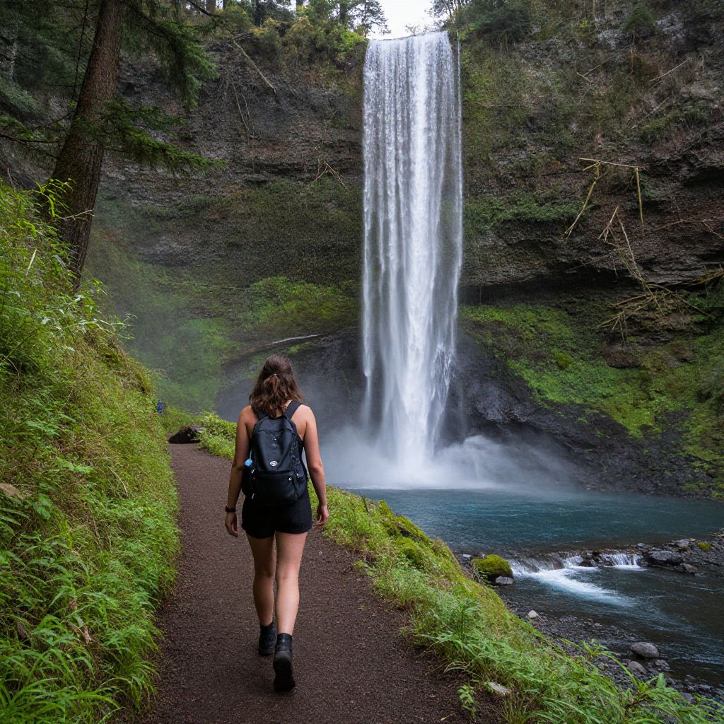 Photograph of a woman with brown hair, wearing a blue backpack and black athletic shorts, walking on a dark, wet trail in a lush, green forest. She is viewed from behind, approaching a powerful waterfall that cascades into a misty pool surrounded by dense foliage. The waterfall's white water contrasts with the dark, rocky cliff and vibrant greenery. The path curves to the left, leading towards the waterfall, with ferns lining the sides. The scene is serene and natural, capturing the beauty of the forest and the waterfall.