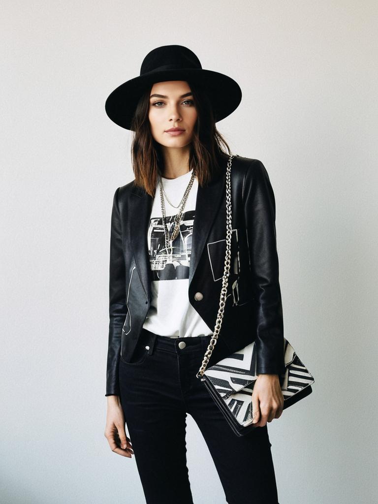 Woman, modern, sleek tailored leather blazer layered over a white graphic t-shirt with abstract print, black skinny jeans with wallet chain, wide-brimmed black felt hat.