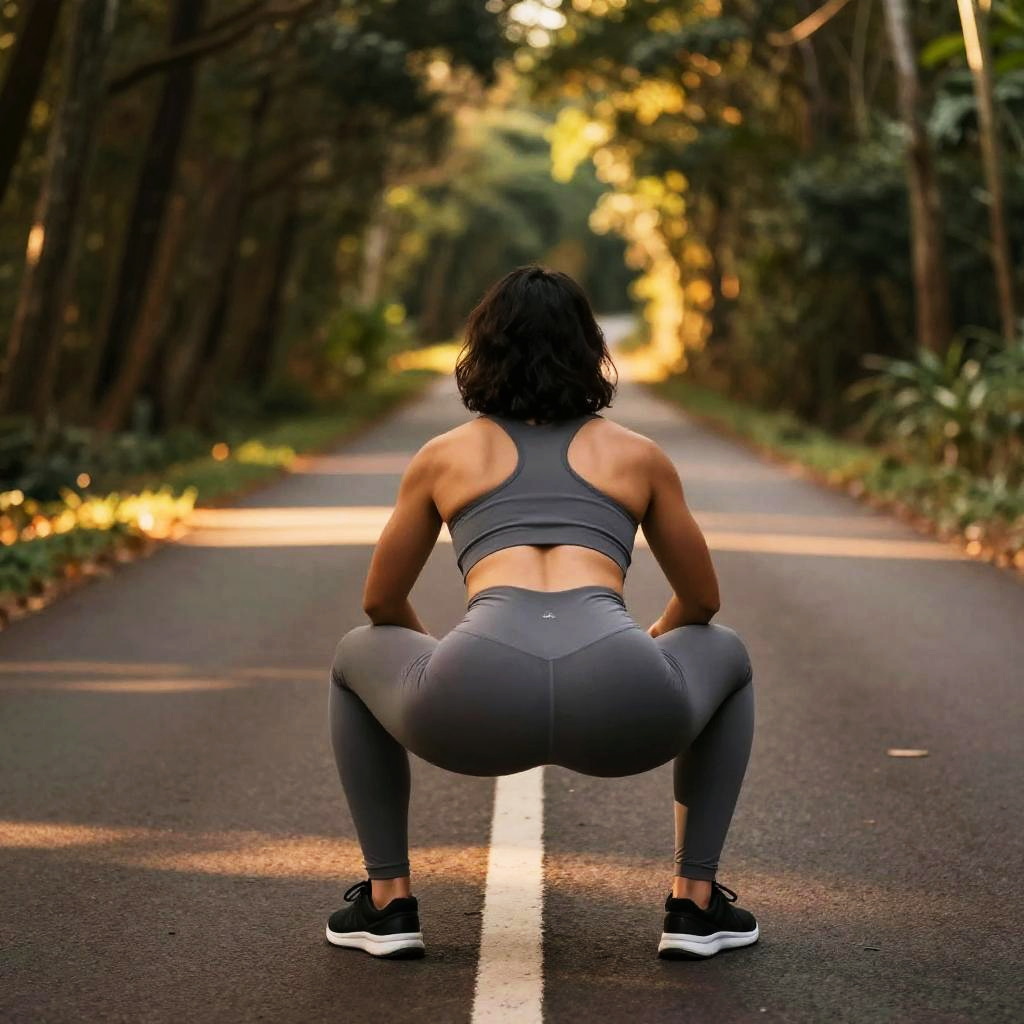 Photograph of a person in black athletic wear, including tight leggings and sneakers, doing a yoga or stretching pose on a sunlit concrete surface. They're positioned on all fours, with their back to the camera, showcasing their toned legs and buttocks. The background is a blurred, gray concrete wall, emphasizing the bright, natural sunlight on the ground.