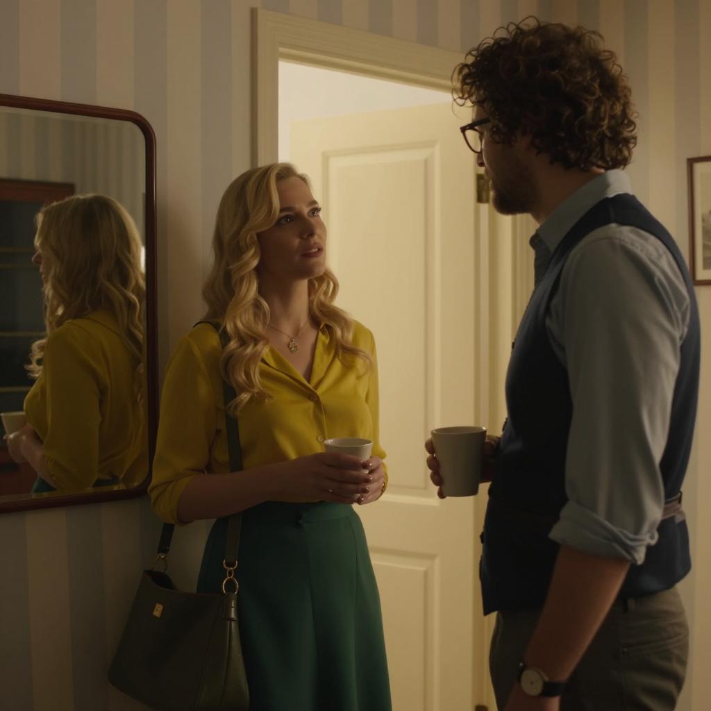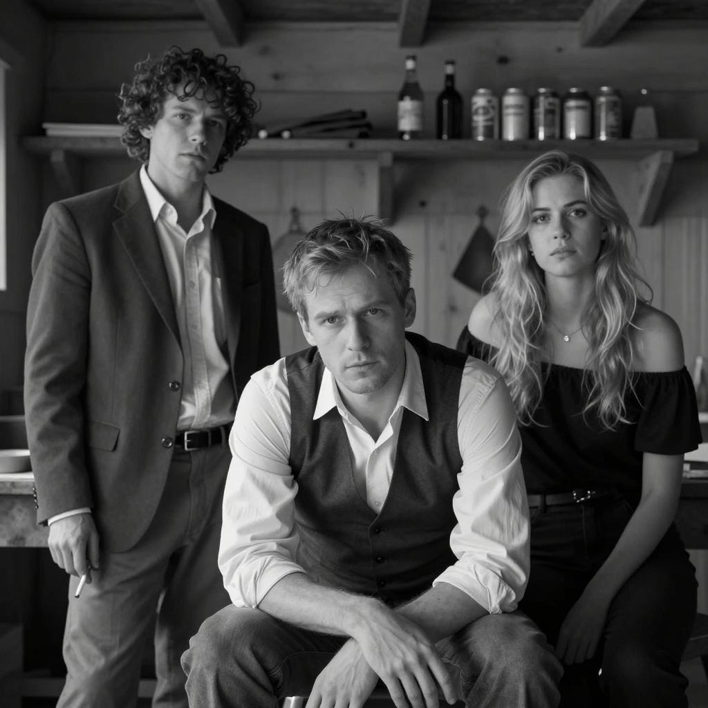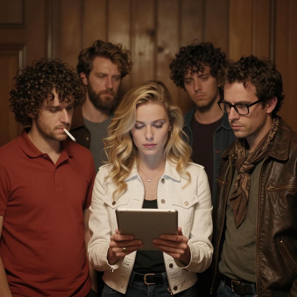 Group of six people in a dimly lit room with wooden walls. Central woman with blonde hair, white jacket, and tablet. Man on left with curly hair, red polo shirt, cigarette in mouth. Man on right with glasses, scarf, and leather jacket. Two men in background with curly hair and serious expressions. Warm lighting, focused attention on central woman.