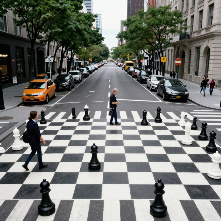 Urban chessboard street scene featuring pedestrians dressed as pawns navigating a giant checkered crosswalk, surrounded by vehicles and flanked by trees and buildings, creating a surreal blend of city life and abstract geometry.