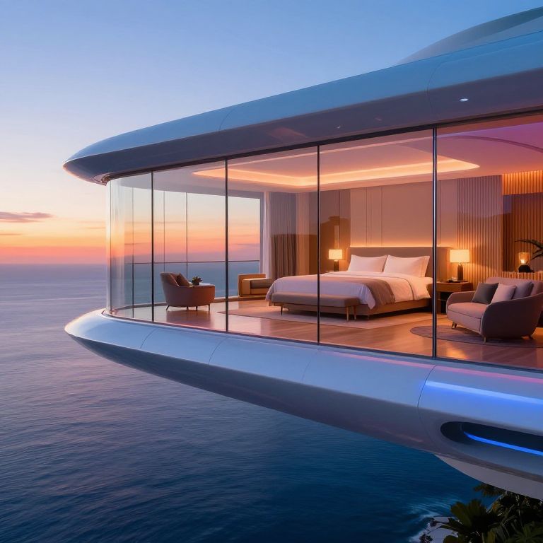 Stays at a futuristic floating hotel above an ocean, sleek architecture with glass walls showing stunning sunset views, serene and luxurious ambiance, high-tech rooms with comfortable interiors, vibrant colors and dynamic lighting effects.