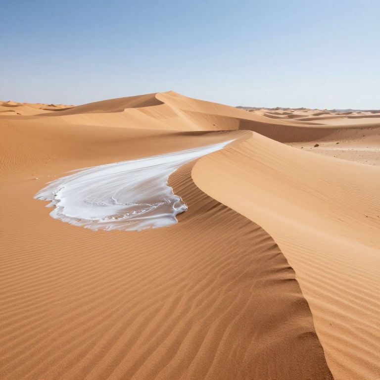 Photograph of a sunlit desert landscape featuring smooth, undulating sand dunes with a winding, reflective water channel cutting through the center. The sand is a rich, golden brown with rippled textures, while the clear, bright blue sky forms a stark contrast. The water's surface glimmers, capturing sunlight, and the dunes create gentle, flowing curves. The scene is devoid of vegetation, emphasizing the arid, pristine environment. The overall composition showcases the natural beauty and tranquility of the desert, with the interplay of light and shadow enhancing the textures.