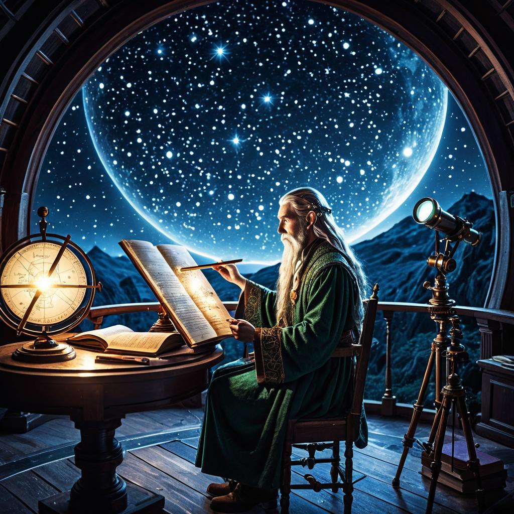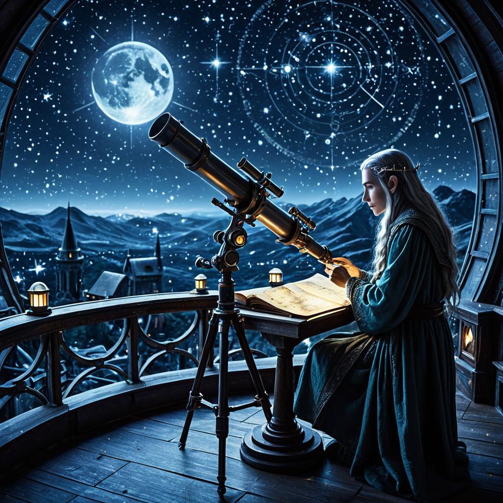 An elven scholar in a celestial observatory, studying star charts and glowing telescopes, with twinkling torchfires and moving lens flares, crisp moonlight glow, intricate and atmospheric, high fantasy theme