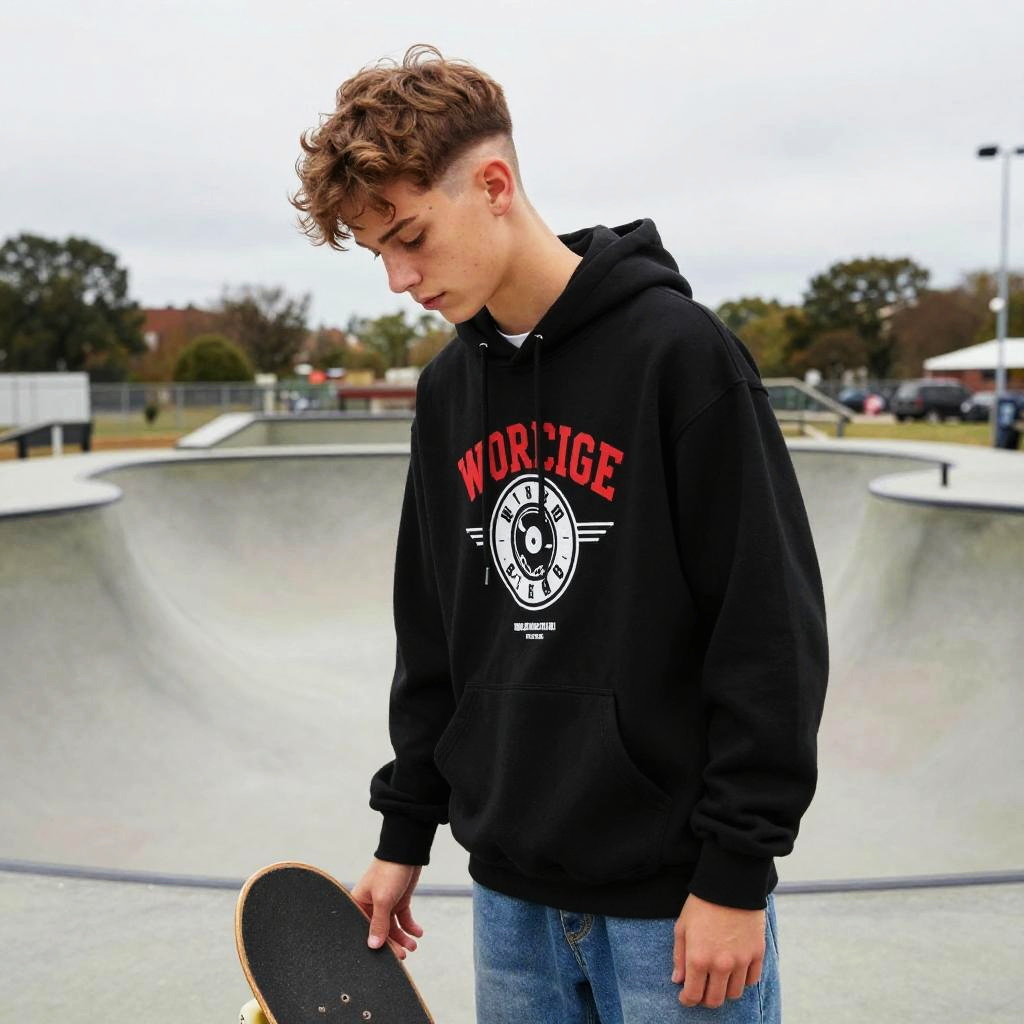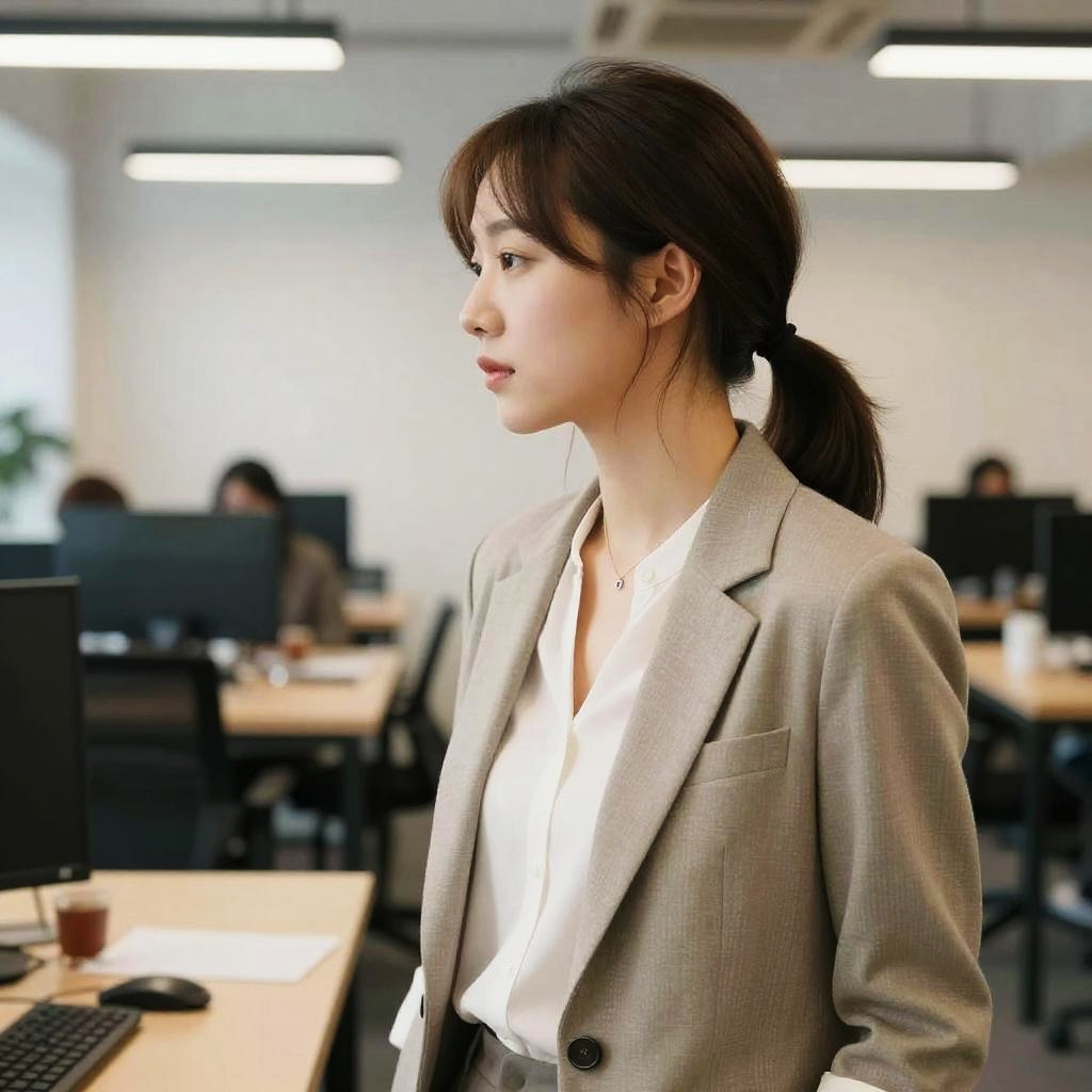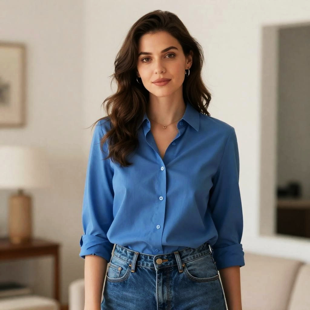 Side Part Undercut hairstyle on female artist, wearing bohemian blouse and jeans, in artistic loft, captured in fashion editorial style with natural diffused light.