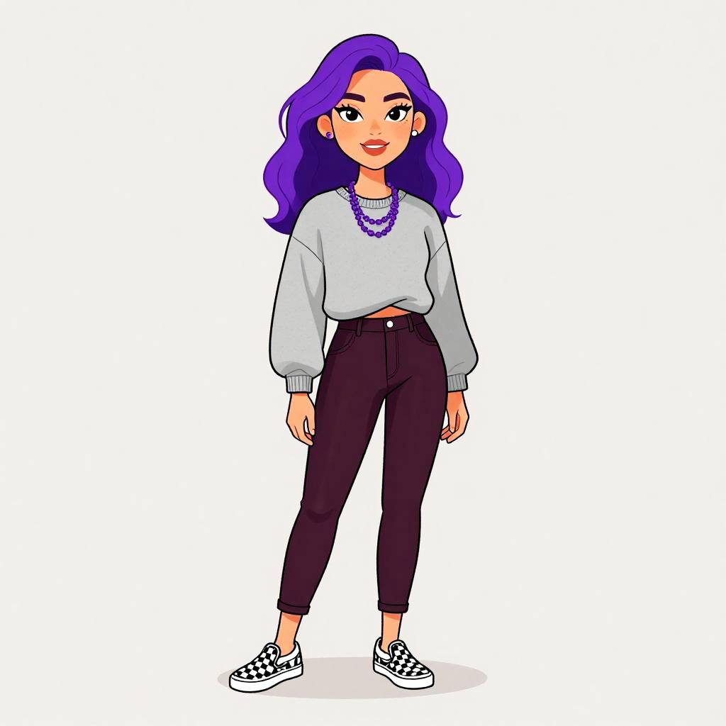 Woman with pretty face and pretty hair. Woman, casual chic, grey crewneck sweatshirt, relaxed fit, ribbed cuffs and hem, burgundy tapered leather trousers, mid-rise waist, side pockets, cropped just above the ankle, black and white checkered slip-on sneakers, layered beaded statement necklace, neutral studio background. --sref 1467