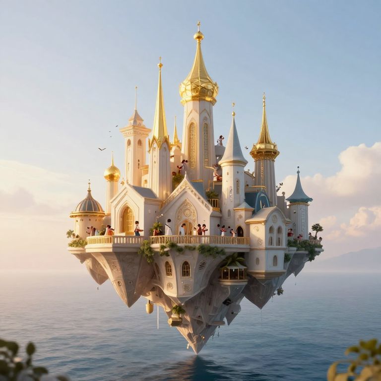 Suspended between sky and sea, a whimsical floating city bathes in the ethereal glow of laughter, its golden spires reaching toward eternity while its citizens, attuned to the rhythm of joy, weave a tapestry of hope and freedom amidst the timeless embrace of nature.