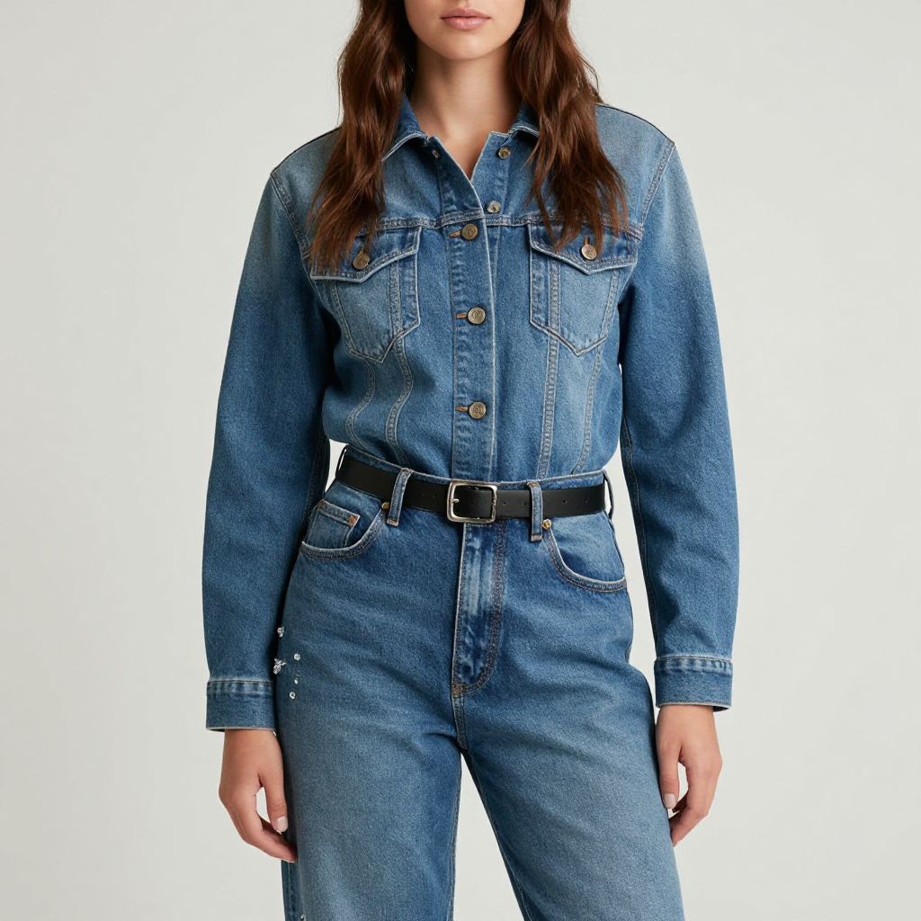 Rough jeans woman costume, 1girl, denim, solo, long hair, brown hair, realistic, jeans, belt, lips, pocket, shirt, photorealistic, pants, looking at viewer, denim jacket, buttons