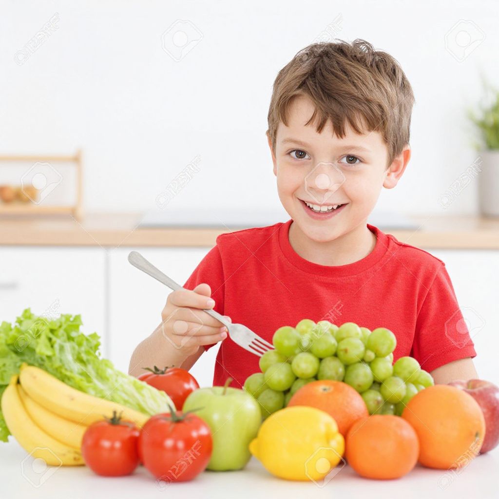 Photograph of a smiling young boy in a red shirt holding a fork, surrounded by colorful fruits like bananas, grapes, apples, and oranges on a