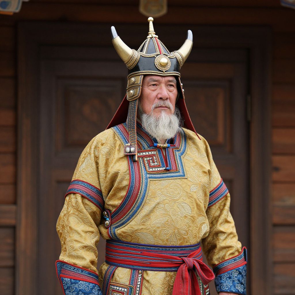 Photograph of an elderly Asian man with a long white beard, wearing a traditional Mongolian warrior outfit. He has a black and gold horned helmet with intricate designs, a yellow robe with blue and red trim, and a red sash tied at his waist. He stands in front of a wooden building with dark brown doors. His expression is serious and focused.