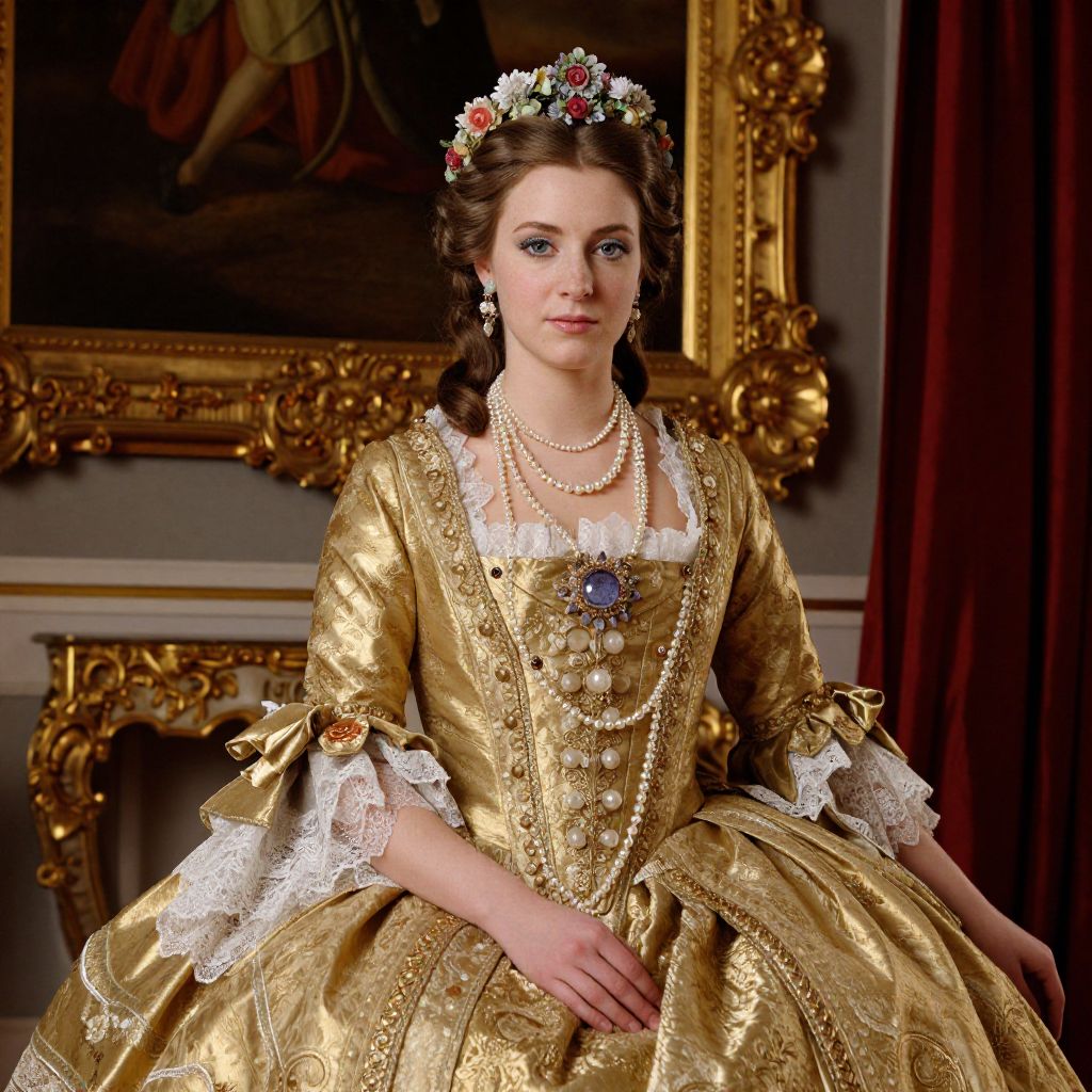 Elegantly poised woman in an 18th-century golden gown adorned with intricate lace details, pearl jewelry, and a floral crown, seated against a backdrop of ornate gold-framed artwork and richly draped red curtains.
