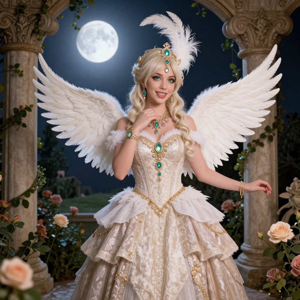 Sally in a lavish fantasy costume filled with feathers, jewels, and a tiered gown, posing in a vintage-themed garden under a full moon with blooming roses and ornate stone pillars, her face illuminated by soft moonlight, showing bright green eyes and a cheerful expression.