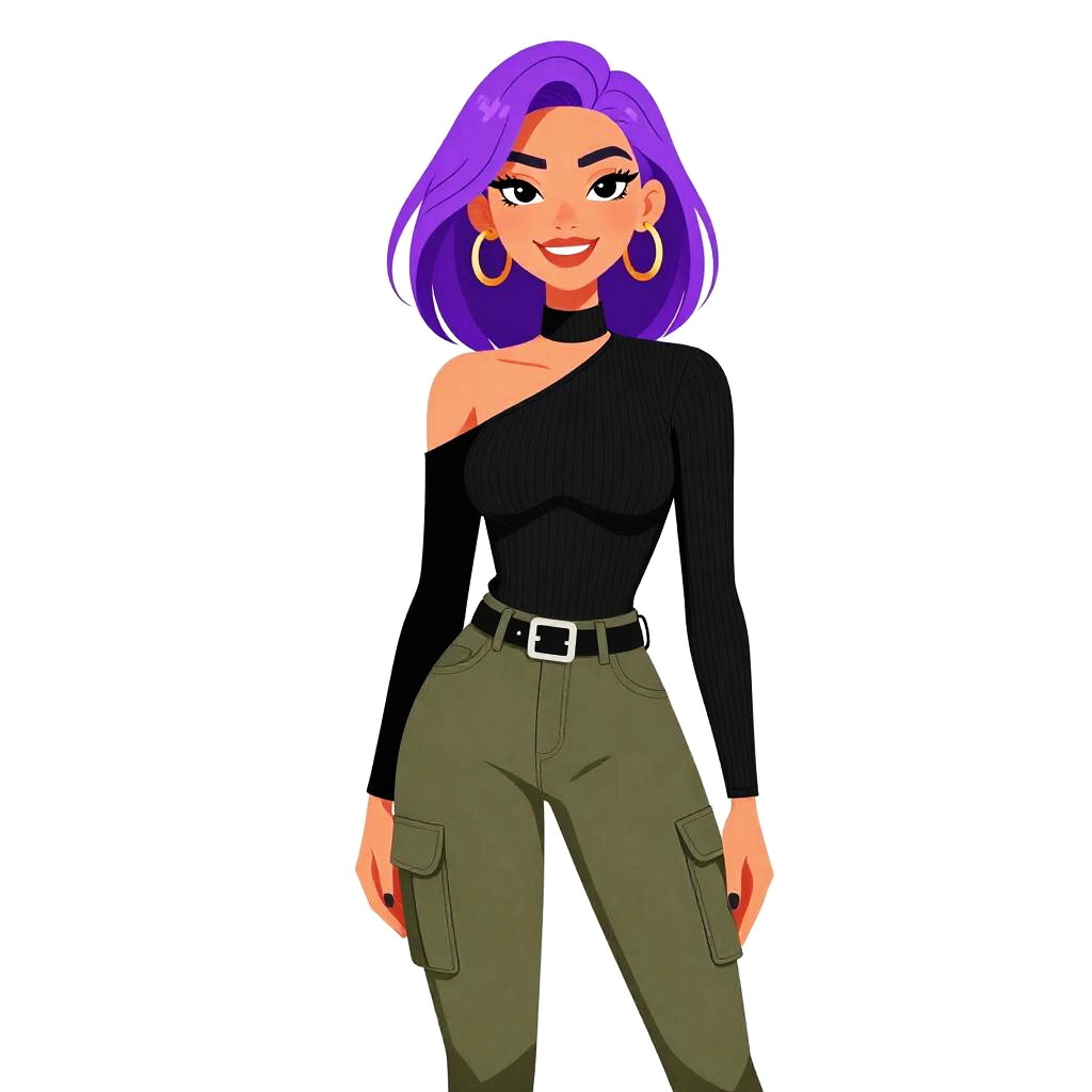 Woman with pretty face and pretty hair. smiling Woman, contemporary urban, black asymmetrical one-shoulder ribbed top with long sleeve, high-neck, olive green tapered cargo pants with belt and side pockets, white background --sref 1467