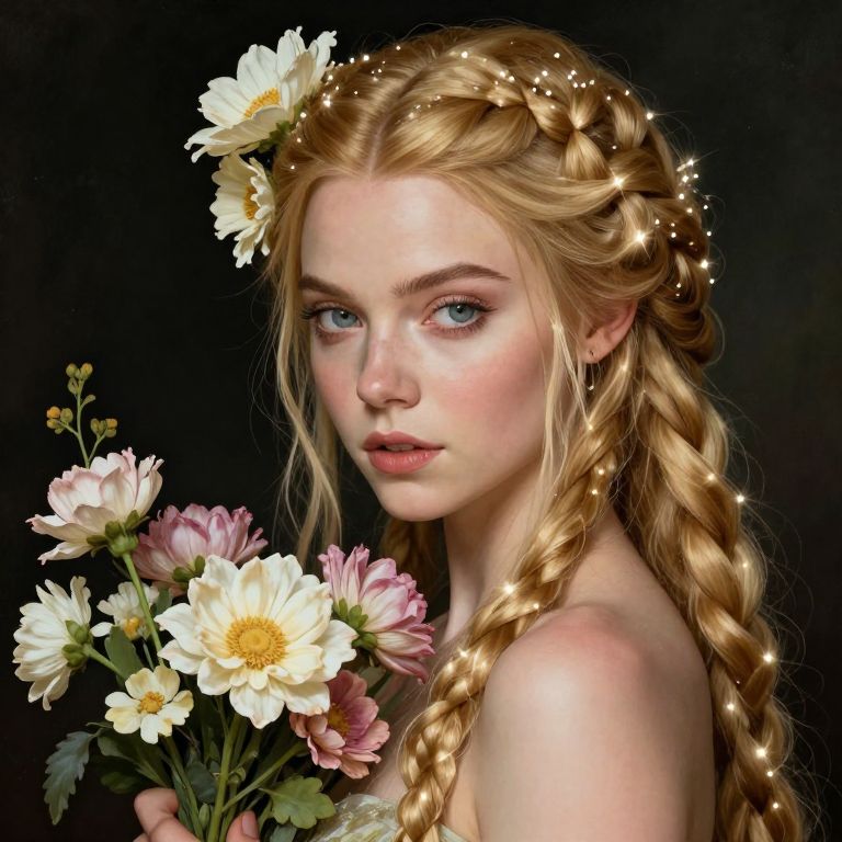 Digital portrait of a fair-skinned, blonde-haired woman with braided hair, blue eyes, and a flower crown, holding daisies against a