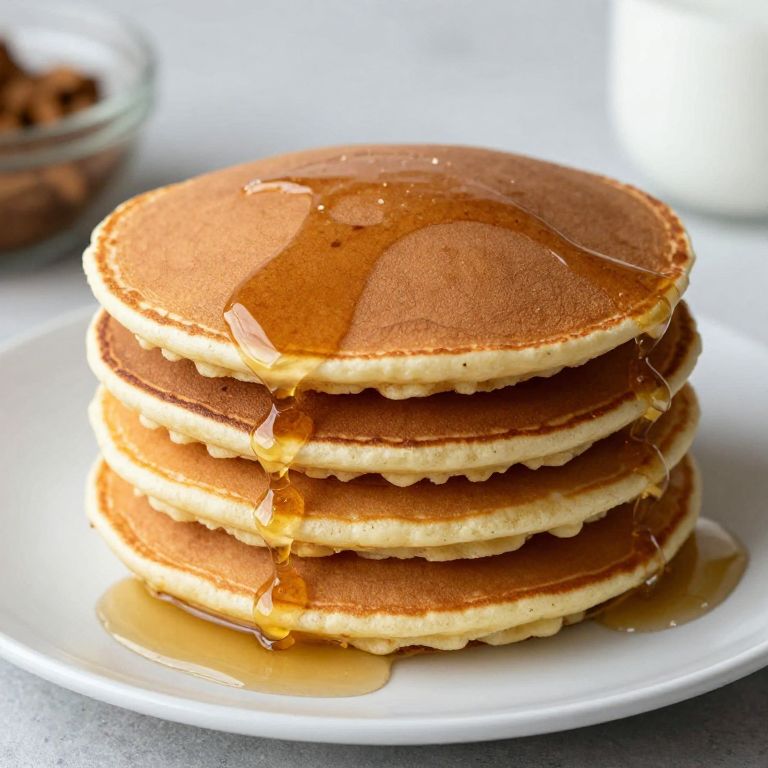 Close-up image of a stack of four golden brown pancakes on a white plate drizzled with maple syrup, with a glass bowl of nuts and a glass of milk blurred in the background.