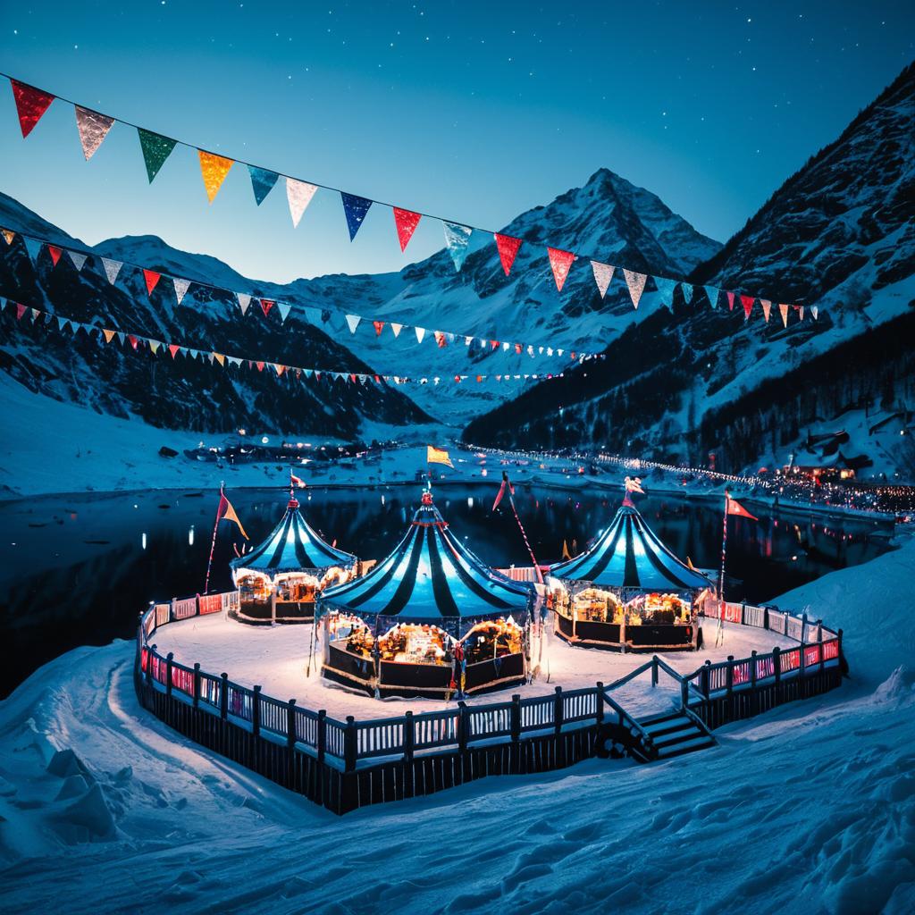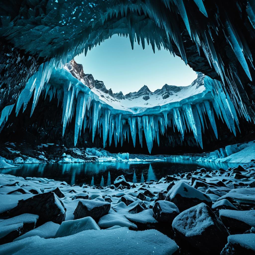An expansive ice cave with glittering blue crystals lining jagged walls with frozen stalactites and shimmering frost perched on a high mountain edge above a black lake at dusk. Captured in frosty cyan tone with cinematic lighting in 4K, the scene has an ultra-realistic feel with a wide-angle perspective.