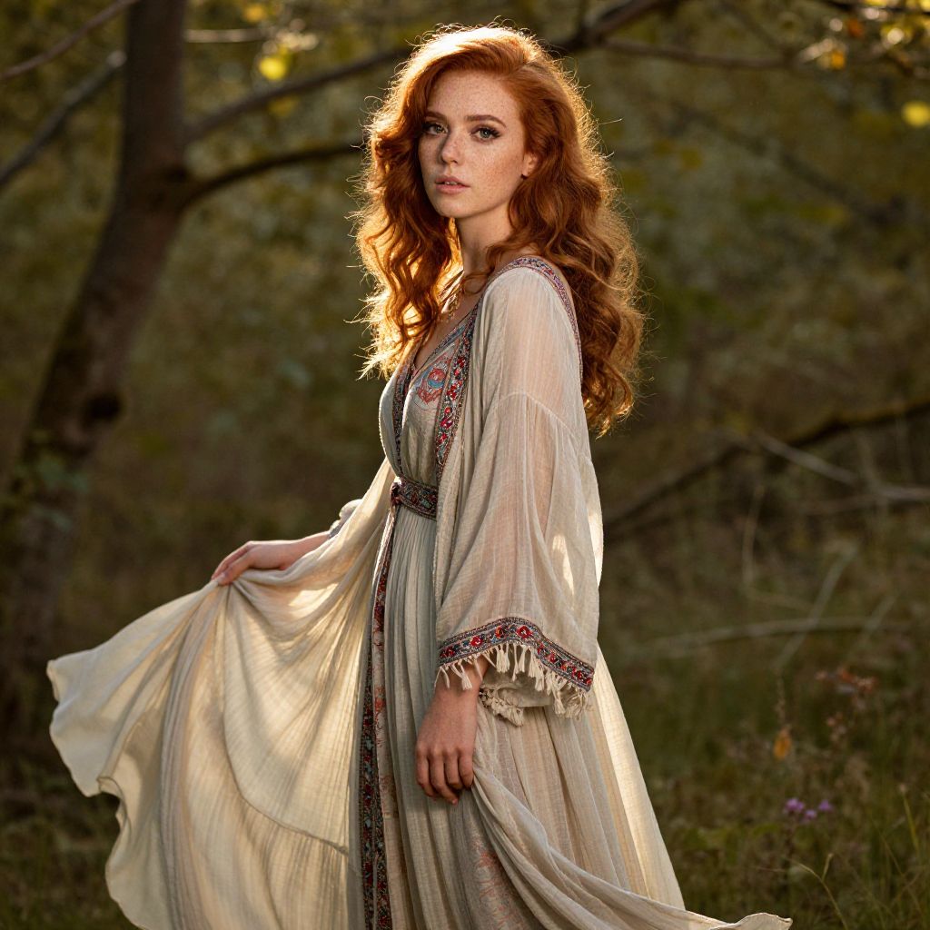 Redhead models female posing elegantly in a sunlit forest clearing, wearing flowing bohemian dresses, soft natural makeup highlighting freckles, vibrant auburn hair catching golden hour rays, dreamy, ethereal atmosphere, high-fashion editorial style.