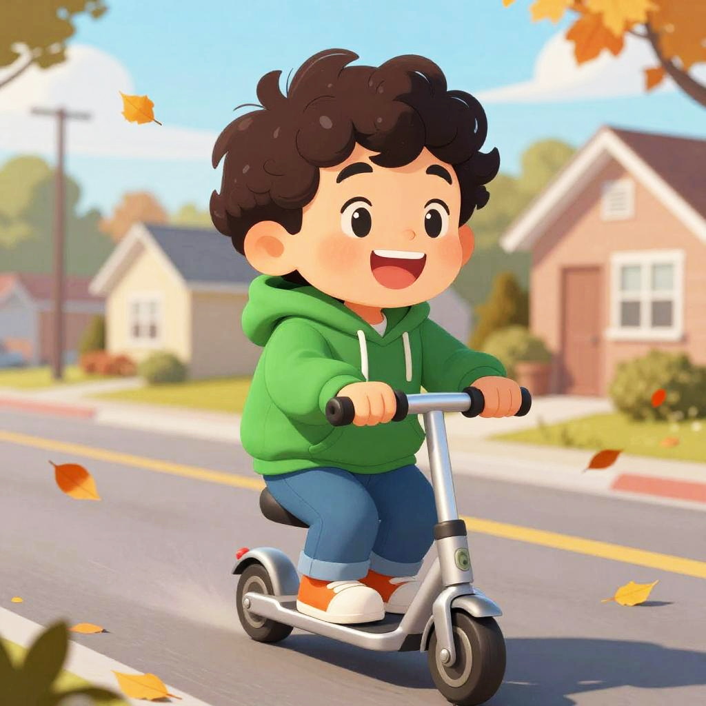 Chubby cartoon boy riding a scooter down a suburban street with autumn leaves falling around, wearing a green hoodie and blue jeans, wide smile and curly hair bouncing in the wind, rendered in a vibrant and dynamic cartoon art style.