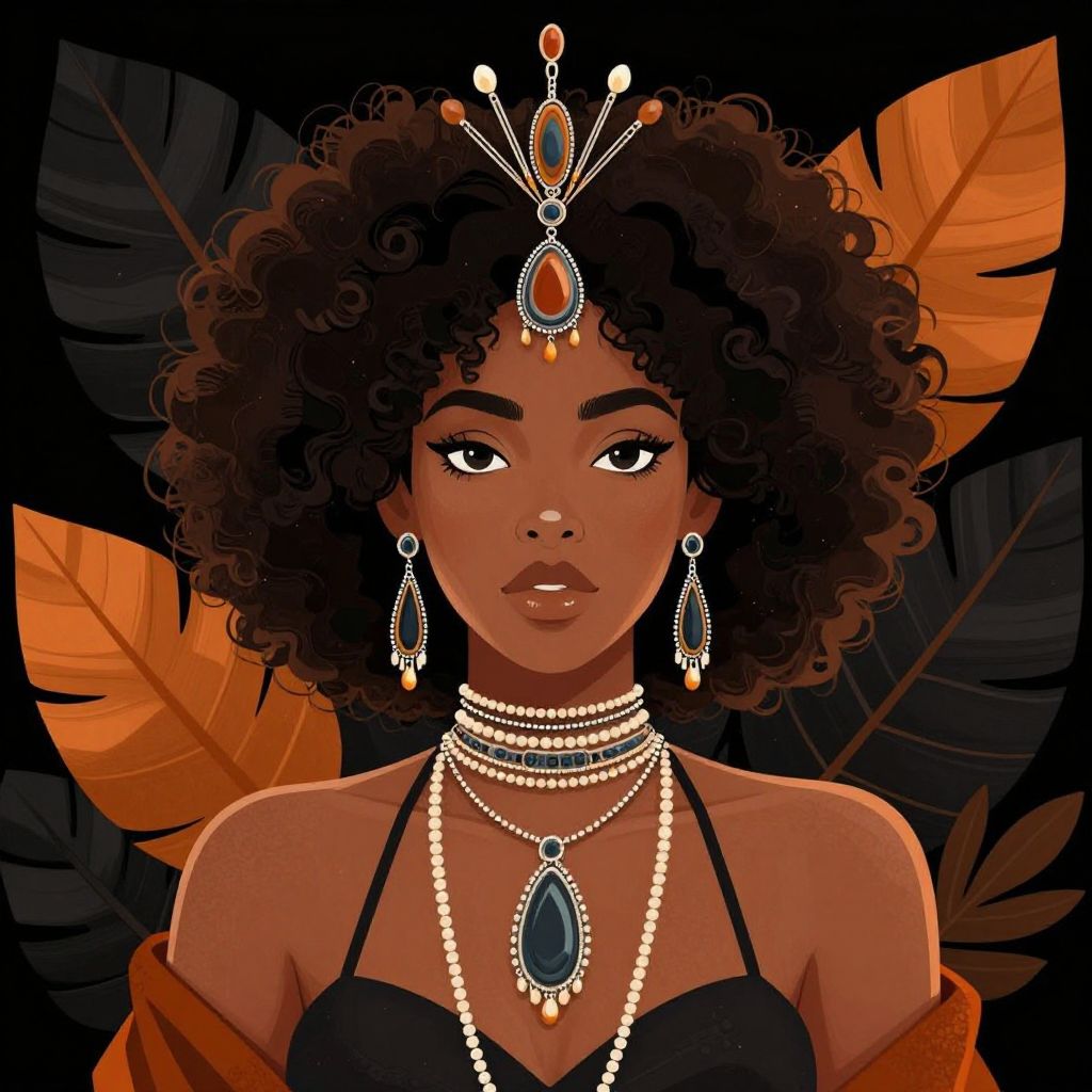 Digital illustration of a dark-skinned, curly-haired woman with a regal expression, adorned with jewelry, wearing a black top against a background of large