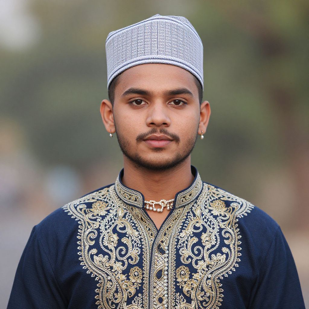 Photograph of a young man with medium brown skin wearing a white and black patterned cap, black embroidered kurta, and small earrings, standing outdoors