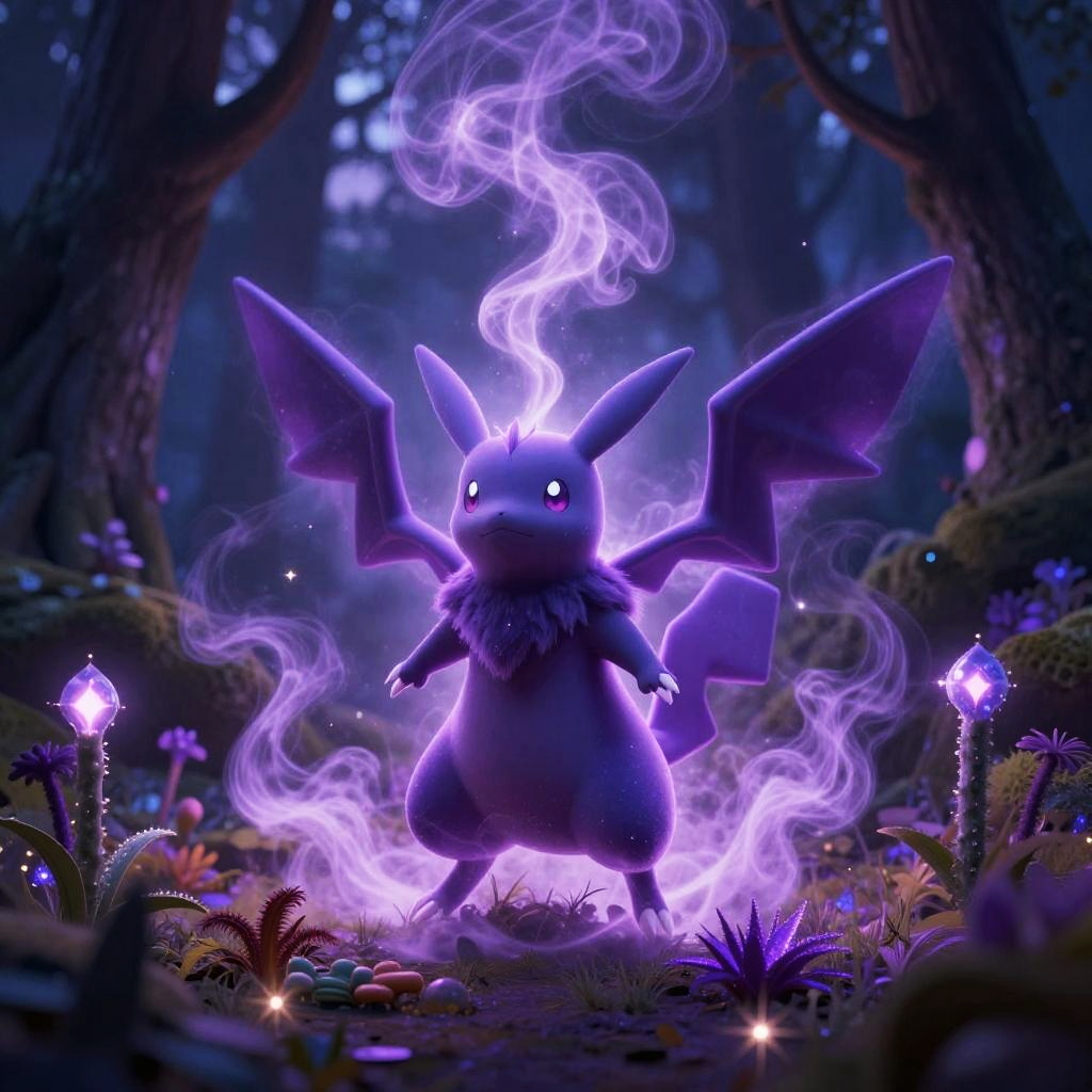 Digital artwork of a fierce, purple, Pokémon-like creature with glowing red eyes, smoke-like appendages, and sharp claws, standing in a dark,