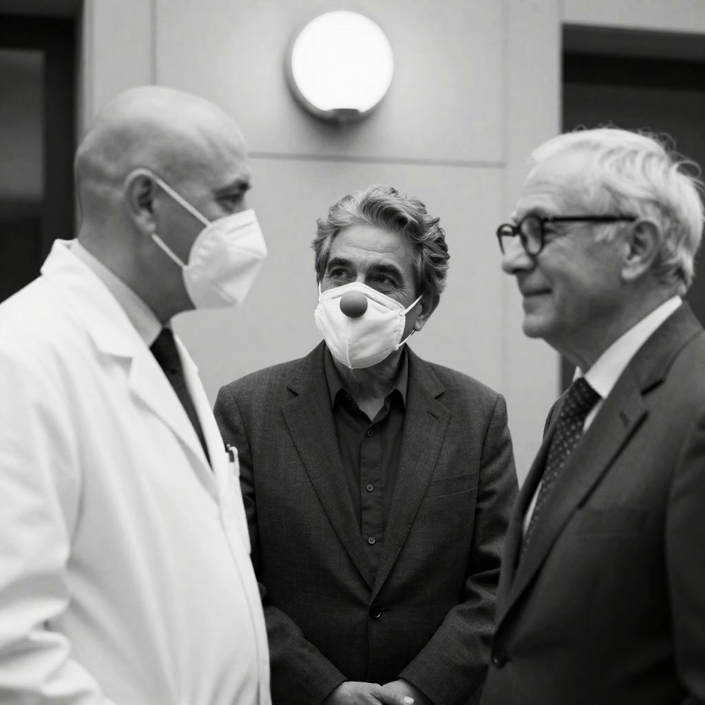Black-and-white photograph. Three men: bald man in white lab coat on left, elderly man with glasses in suit on right, third man with white cloth mask featuring a tuft of hair and round nose in center. Masked man speaks, elderly man smiles, bald man looks serious. Background: tiled wall, round light fixture.